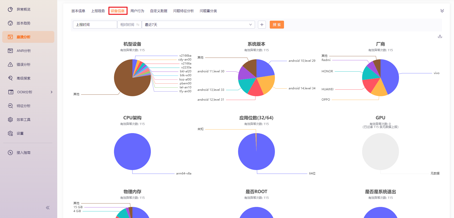 部分问题和设备类型是强相关的,查看设备信息分布,从机型、品牌、gpu、存储、内存等多角度分析问题出现的可能原因